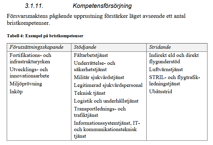 Myndigheten redovisar återigen det som varit känt under flera år, att det finns en brist på personal inom en rad kompetensområden såsom teknisk tjänst, IT, logistik och STRIL. Det nya är att bristkompetenserna nu kategoriseras som ”förutsättningsskapande”, ”stödjande” och ”stridande” samt att det tillförts ytterligare kompetenser som tidigare inte kommunicerats rakt ut men som varit kända inom myndigheten.